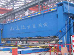 船用三輥對稱式卷板機結(jié)構(gòu)型式為三輥對稱式,上輥在兩下輥中央對稱位置作垂直升降運動,通過液壓缸內(nèi)的液壓油作用于活塞桿而獲得,為液壓傳動;通過特殊設(shè)計減速機分別帶動全滾動軸承的兩下輥作旋轉(zhuǎn)運動,為卷制板材提供扭矩;在下輥下部設(shè)有多組托輥,以提高下輥的剛度,并可進行垂直調(diào)節(jié);在上輥的上部設(shè)有剛性大梁,在大梁與上輥之間設(shè)有多組托輥,以提高上輥的剛度;適用于超寬圓弧形零件的卷制。可卷板厚3mm-50mm,板寬21000mm的板料。